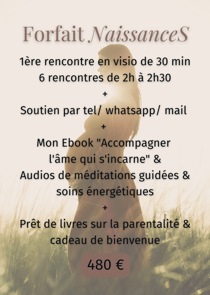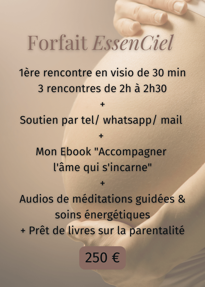 - 3 ou 6 rencontres de 2h à 2h30 en pré et / ou postnatal (à domicile ou en visio), alliant temps d‘écoute, de transmission, de retour au corps, des pratiques énergétiques ou des méditations guidées.